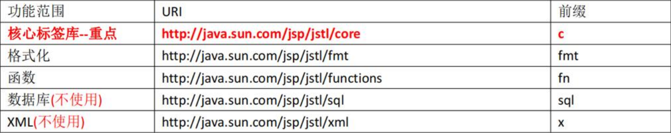 <%@taglib prefix="c" uri="http://java.sun.com/jsp/jstl/core" %>写在页首; - JSTL 由五个标签库组成,我们这里只简要介绍第一个核心标签库: