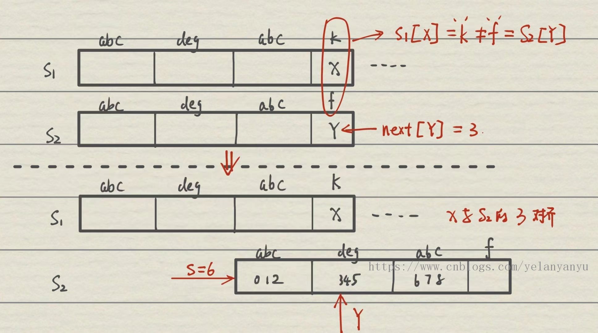 s1[i...X]=abcdegabck,s2[0...]=abcdegabk; 显然,此时next[y]=3,所以将 Y 指向 s2 的 3 位置,这样我们就可以省略s1[0...2]的字符比对,很大的提高了效率。