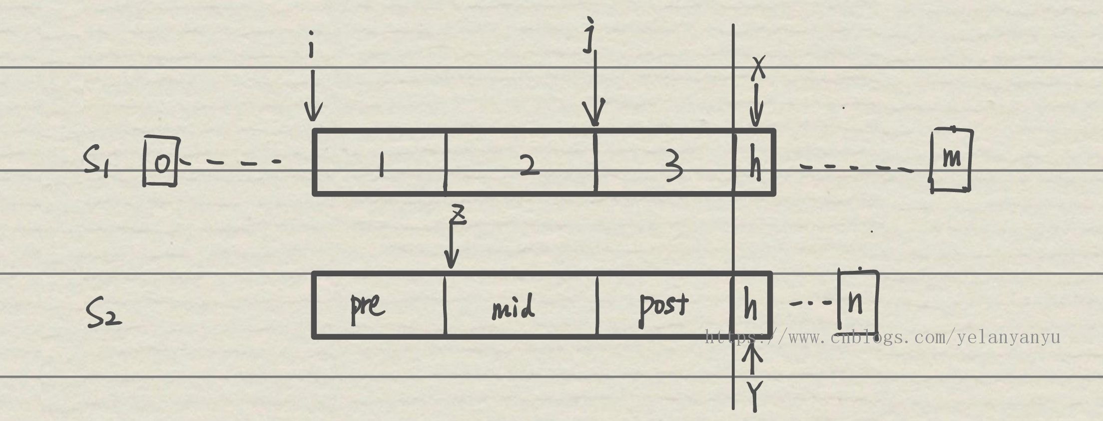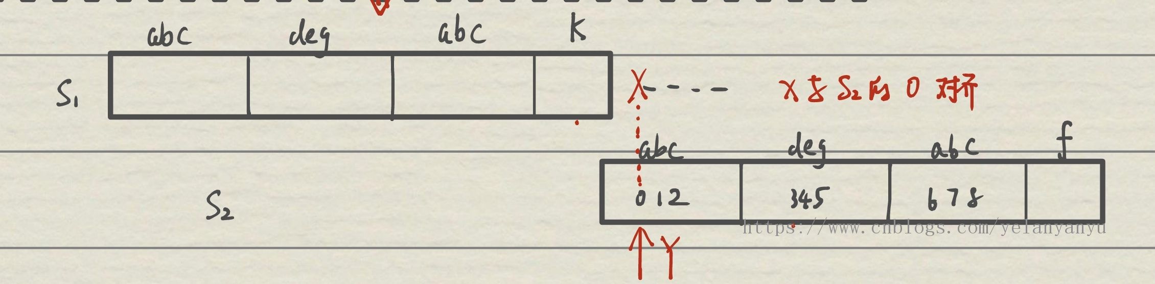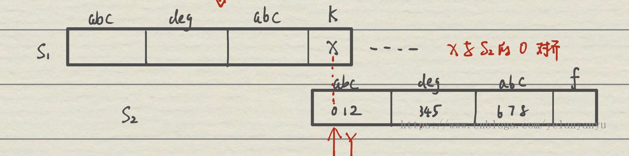 设 s1 从下标 i 开始就可以和 s2 进行匹配,直到到 h 位置字符才出现不一样,此时 x 处于 x+h,y 处于 h 位置。