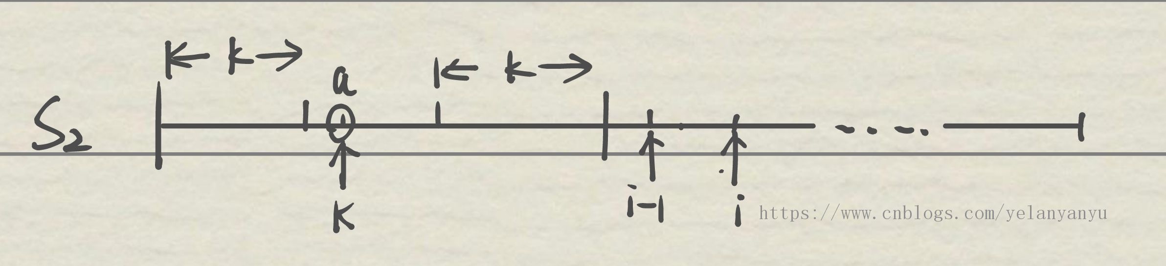 设next[i-1]=k,s2 数组中 i-1 位置的前缀末尾的后一位为任意字符 a,显然 a 字符的下标就应该为 k,现有如下可能: - 假如 i-1 位置的值可以与 k 位置的字符 a 相同,那么