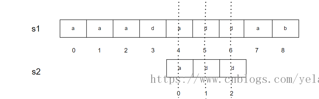 3. 总结一下,以上的流程就相当于 s2 是一个窗口,0 位置就相当于是窗口的开头,2 位置就相当于是窗口的末尾,如果窗口在当前位置没有匹配成功,就将窗口向右移动一个位置,直到匹配上或者窗口的末尾超出了 s1 的末尾为止;