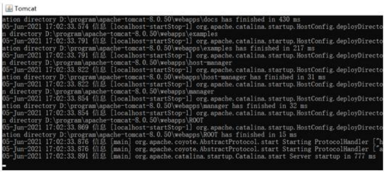 startup.bat文件,双击。出现黑色窗口后不要关闭,不要关闭,不要关闭。此时 Tomcat 已经装载完毕;黑色窗口如下: