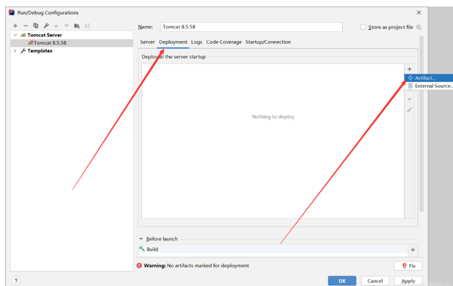 - 在右边的部署栏 Deployment 中点击+号,添加构建: