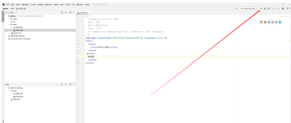 运行 Tomcat,访问项目:这里注意要直接选择 Tomcat, 点击运行按钮,而不是在 jsp 页面上右键点击运行,这样会访问不到页面(JSP 不是静态资源):