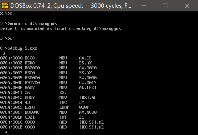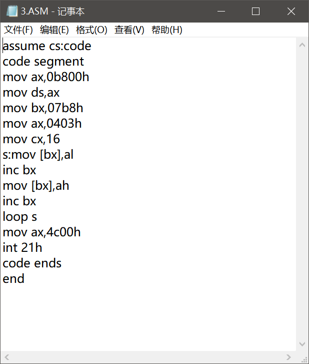 总结:程序中,可以用[bx]存放偏移地址,然后开始循环,而实验中提到的进行完第三个实验才能开展接下来的课程,应该是指[bx+idata],能够将实验更加简洁化。