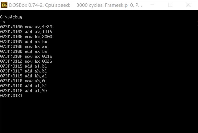 结论:使用T命令和A命令将指令写入内存中,A命令更加简洁方便使用