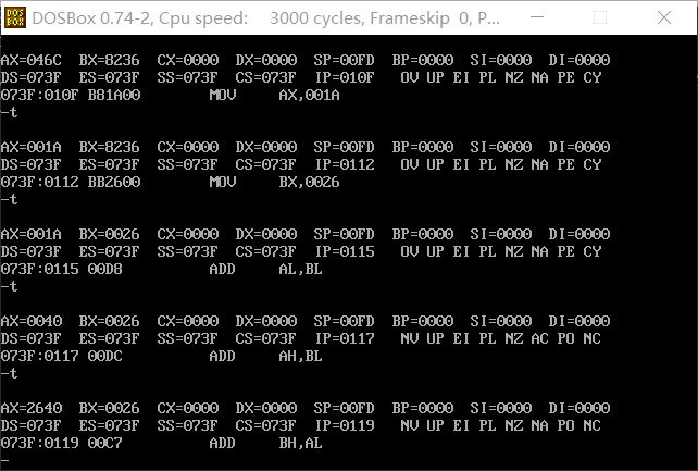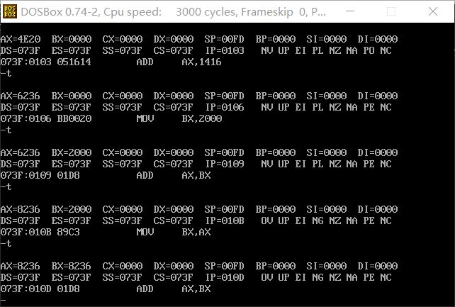 1,使用debug,将下面的程序段写入内存,逐条执行,观察每条指令执行后CPU中相关寄存器中内容的变化