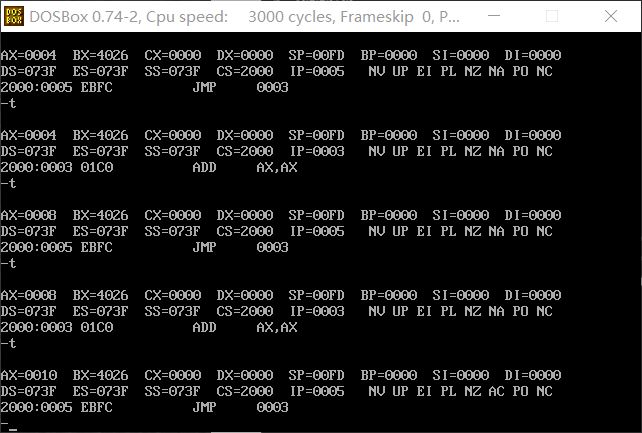 2,将下面的3条指令写入从2000:0开始的内存单元中,利用这3条指令计算2的8次方