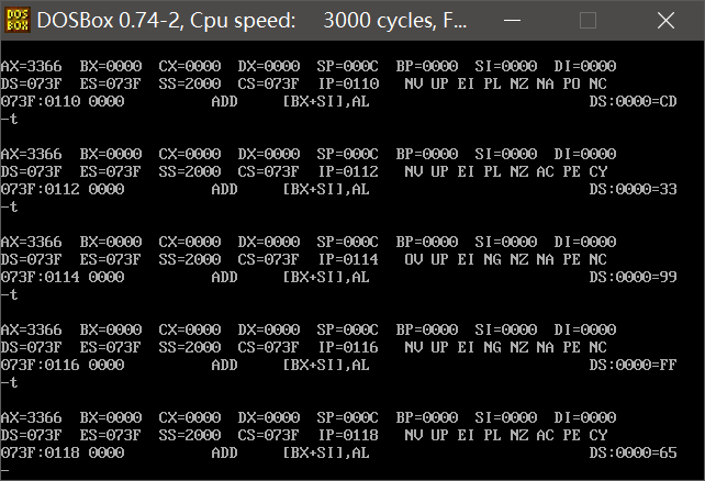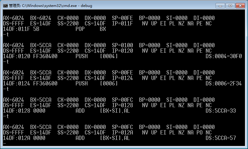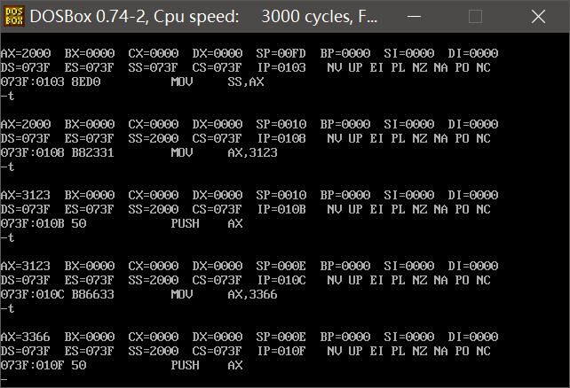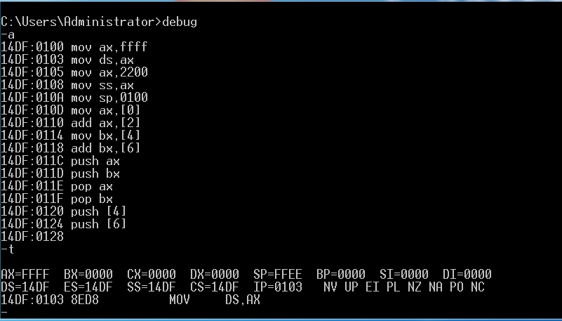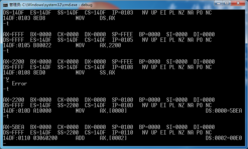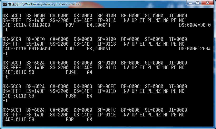 ②使用a命令输入p74的指令。用t单步执行各指令,并按照要求查看修改内存的地址和内容。