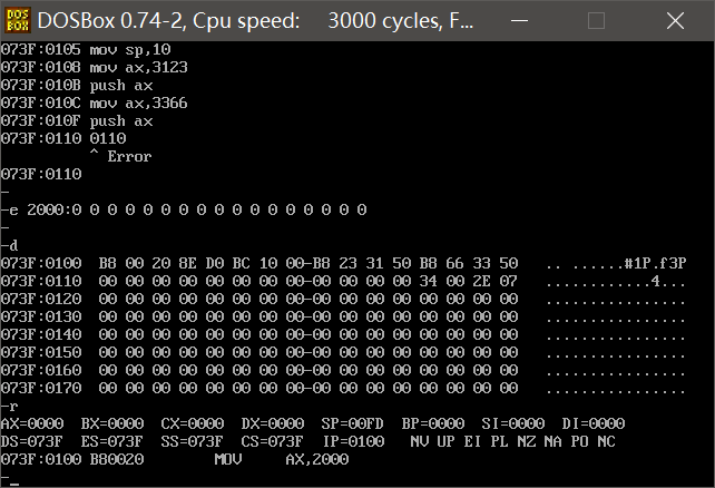 用a命令输入教材中指令,使用e命令修改2000:0~2000:f的值并查看