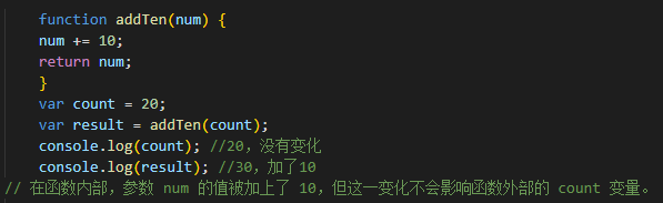 ①向参数传递基本类型的值时,被传递的值会被复制给一个局部变量(即命名参数,或者用ECMAScript 的概念来说,就是 arguments 对象中的一个元素)。