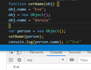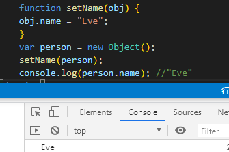 对比两图代码会发现person对象的name属性值均为"Eve",如果 person 是按引用传递的,那么 person 就会自动被修改为指向其 name 属性值为"dorola"的新对象。但是,可以看到接下来再访问 person.name 时,显示的值仍然是"Eve",所以说对象是按值传递的。
