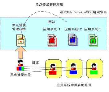 用户在其中注册一个单点登录账号,然后针对每个应用系统绑定一个该应用系统中原有的账号,并维护这些注册和绑定信息。绑定的过程需要单点登录管 理应用服务器到应用系统服务器上验证用户提供的该应用系统中原有账号和密码,应用服务器均以相同的Web Service接口提供该功能支持。