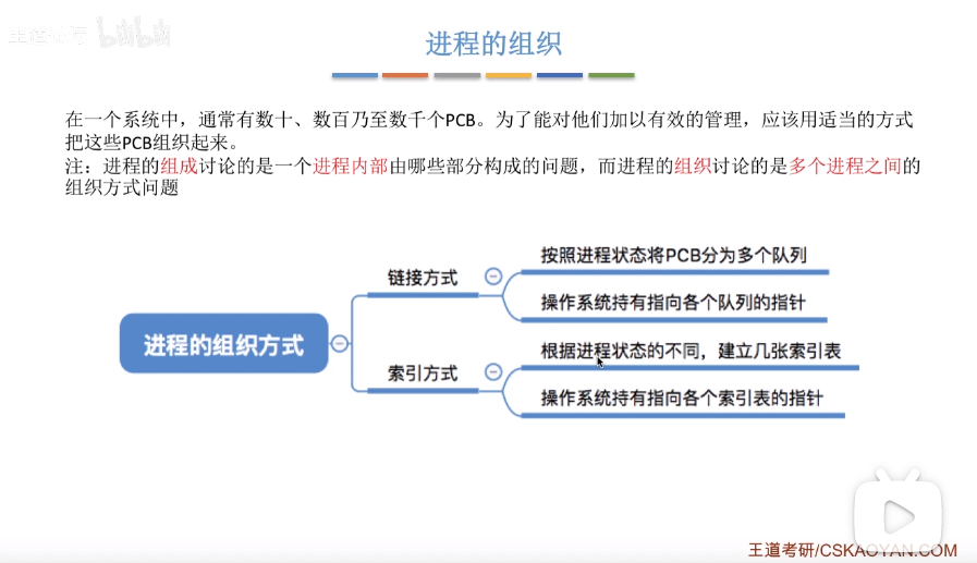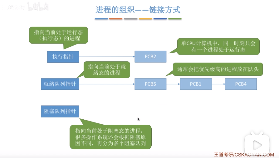 链接方式中操作系统会持有一系列指针,每一个指针会指向不同状态的进程队列