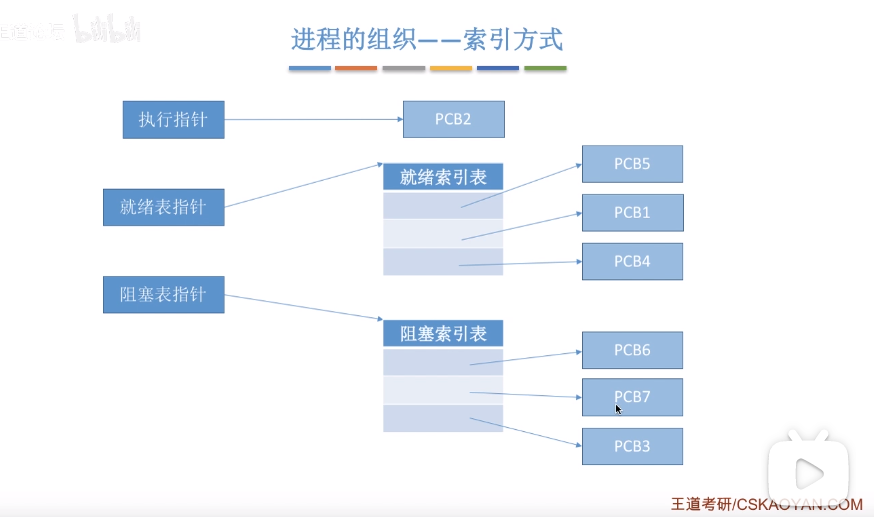 操作系统会为不同状态下的进程建立不同的索引表,指针指向索引表,索引表表项指向处于此表对应状态下进程中的PCB