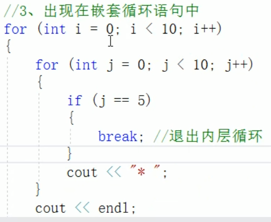 - 出现在嵌套循环中,跳出最近的内层循环语句