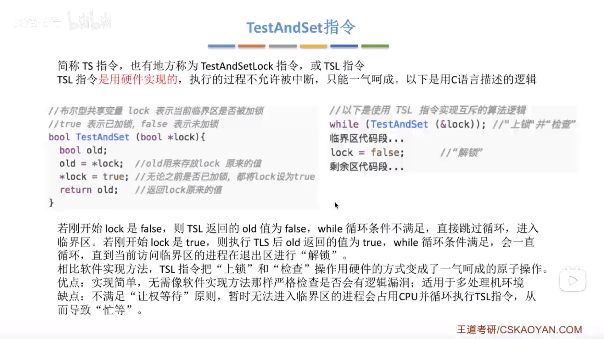 注意:TSL指令是由硬件实现的,下面只是用C语言描述逻辑过程(在实际硬件执行过程中,lock值被储存在物理寄存器中)