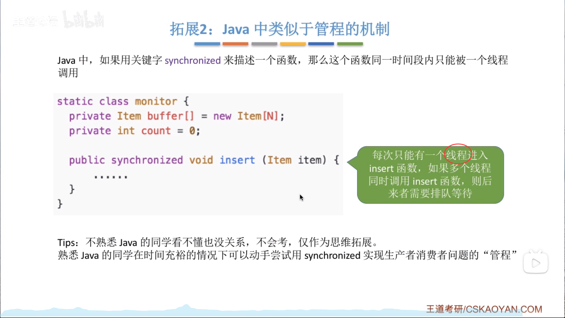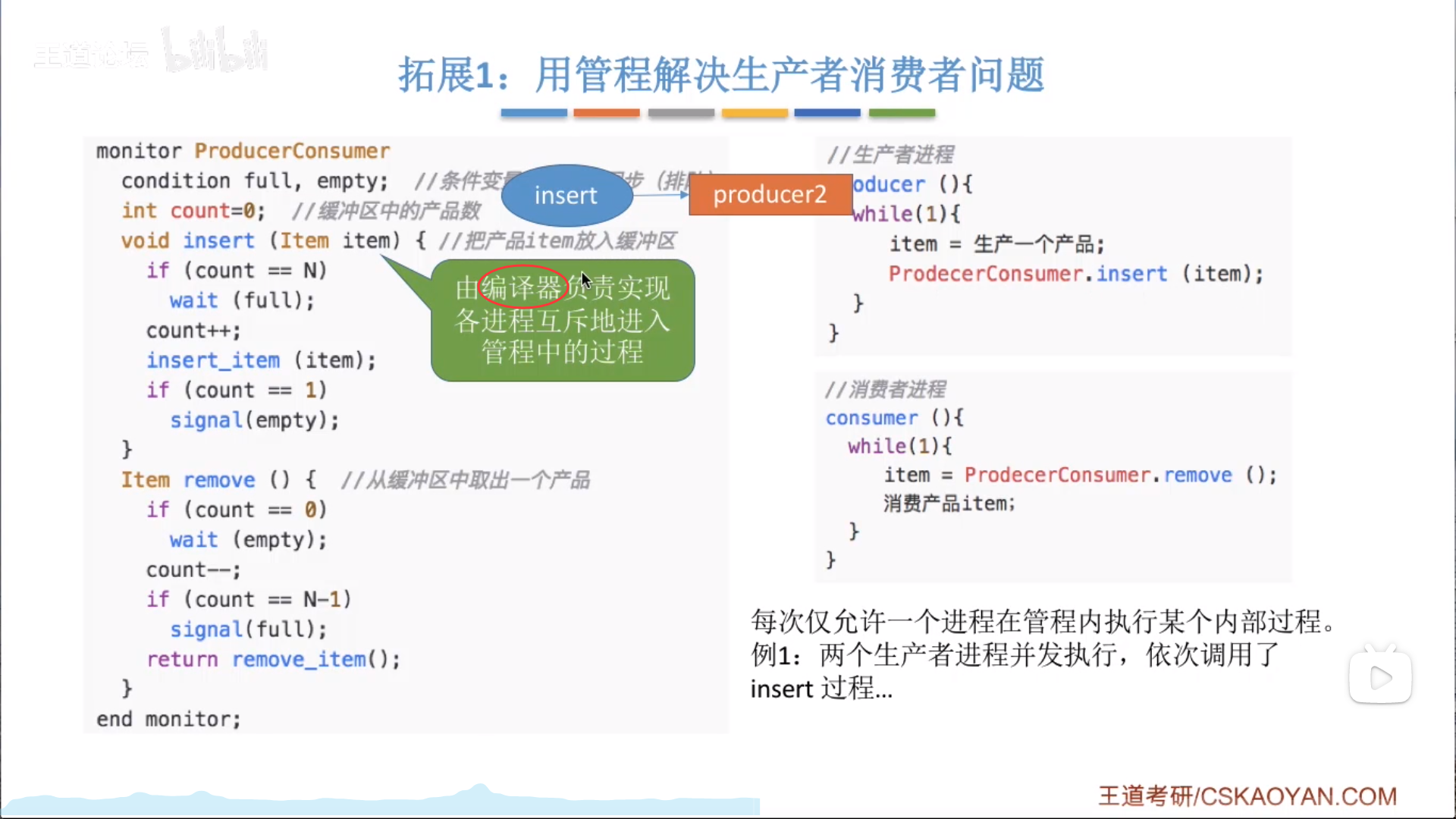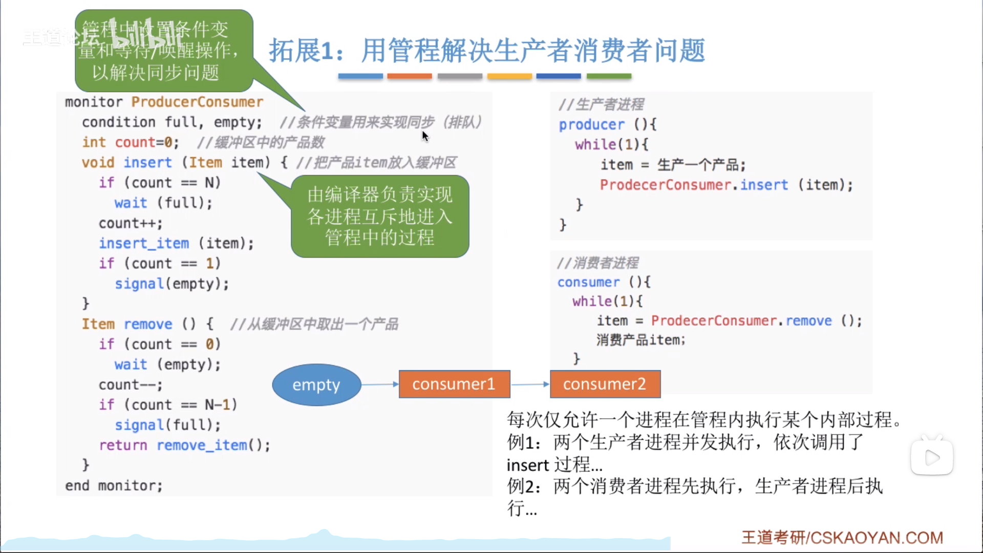 - 同步问题:两个消费者进程先执行,生产者进程后执行时;先开始count = 0,第一个消费者执行wait操作;所以第一个消费者进程等待在empty条件变量相关的队列中;同样的,第二个消费者也等待在empty条件变量相关的队列中。生产者进程开始执行,把自己生产的产品放在缓冲区当中;并且判断自己生产的产品是不是缓冲区中的第一个产品,如果是第一个产品,意味着有别的消费者进程在等待队列,所以在生产者进程会执行signal函数,在empty变量对应的等待队列中唤醒一个消费者进程。消费者先是取走一个产品,然后检查在自己取走产品之前,缓冲区是不是满了;如果满了,则说明之前可能有生产者进程在等待,于是消费者进程执行signal,在full变量对应的等待队列中唤醒一个生产者进程。