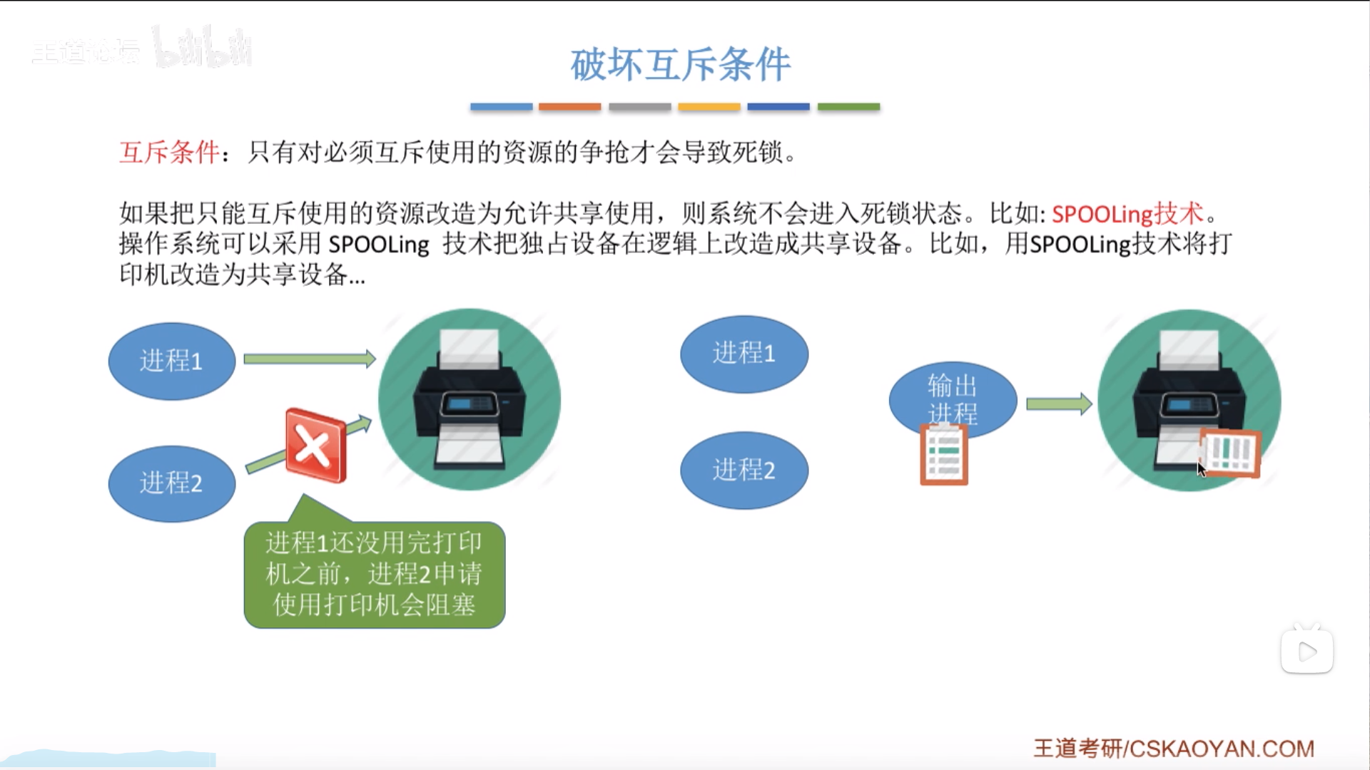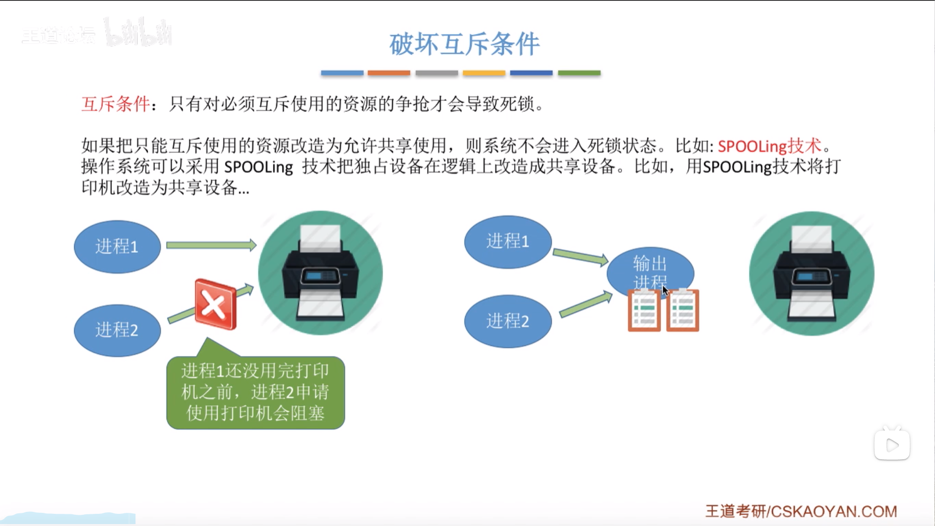 采用SPOOLing技术之后,进程1和进程2使用打印机的请求被输出进程接收,则进程1和进程2则可以开始往下执行;之后输出进程会根据各个进程请求顺序,依次使用打印机,打印输出