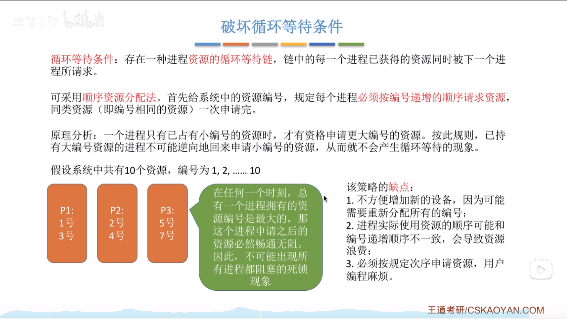 假设进程P3需要使用5号资源打印机,和7号扫描仪,实际过程中P3进程需要先使用扫描仪,再使用打印机;但由于编号递增的要求,P3进程必须先申请占有用不到的5号打印机,之后打印机空闲很长时间,直到扫描仪被使用完,才会再使用打印机资源。这就造成打印机资源长时间空闲,导致系统资源的浪费。