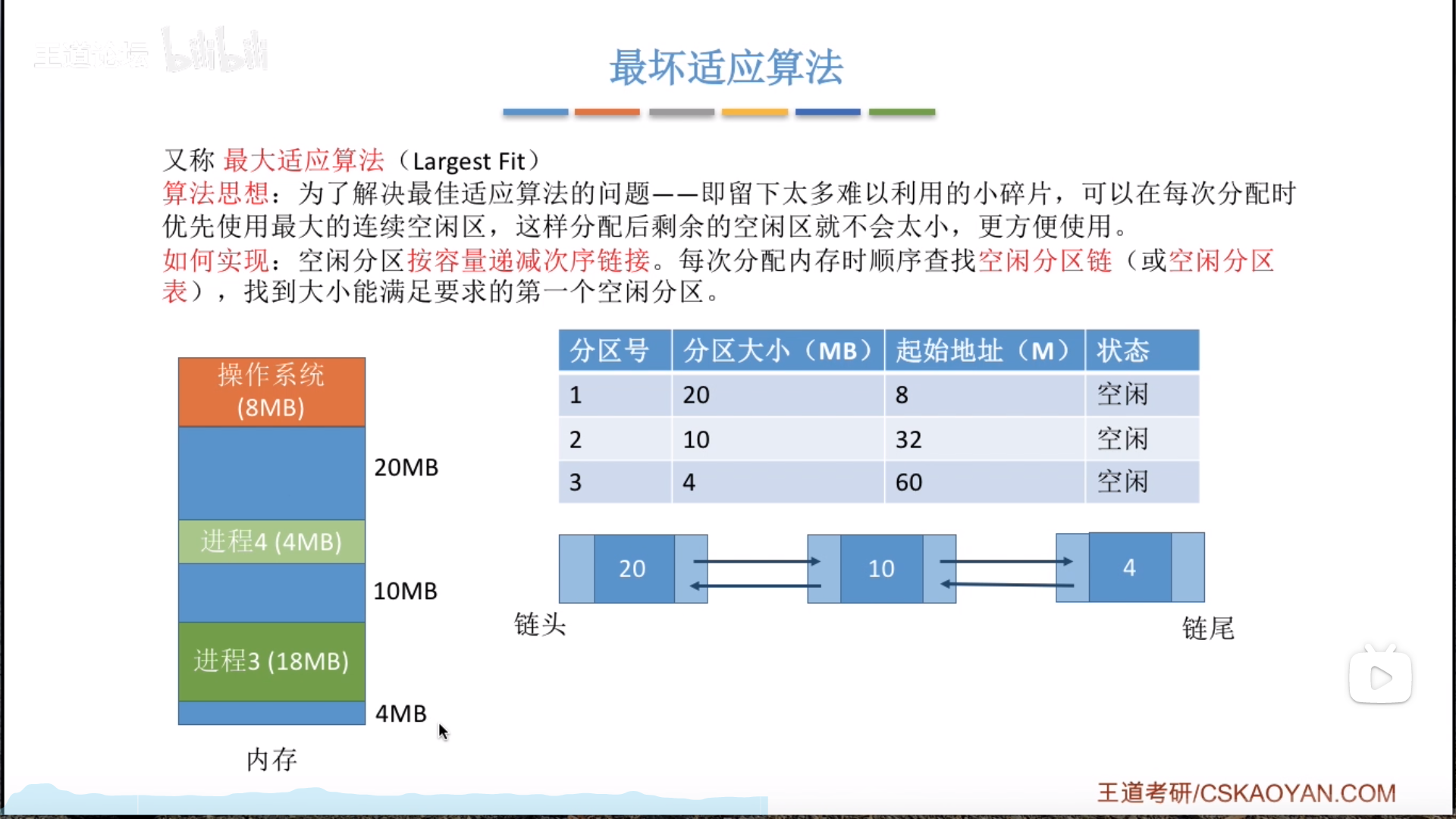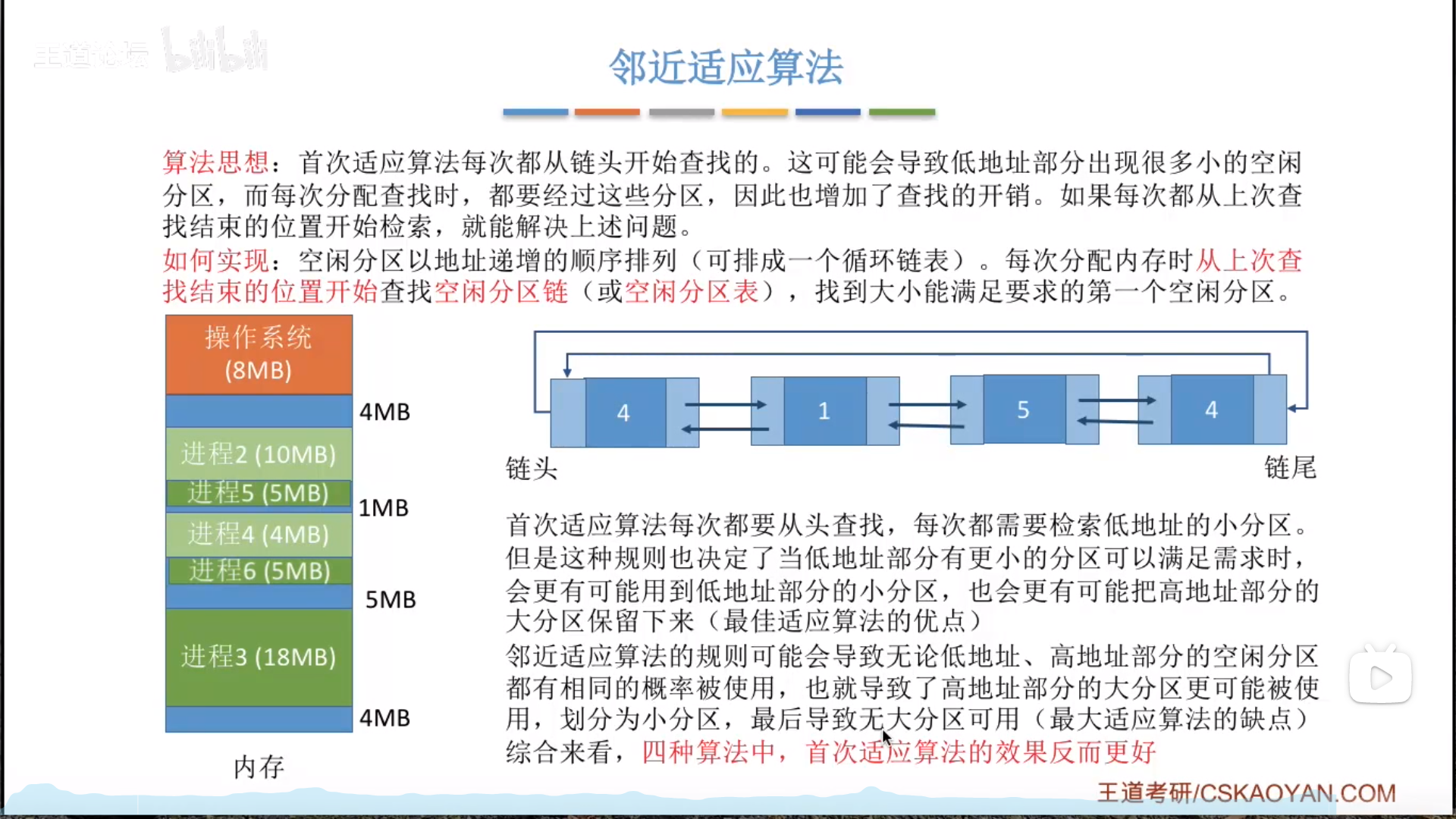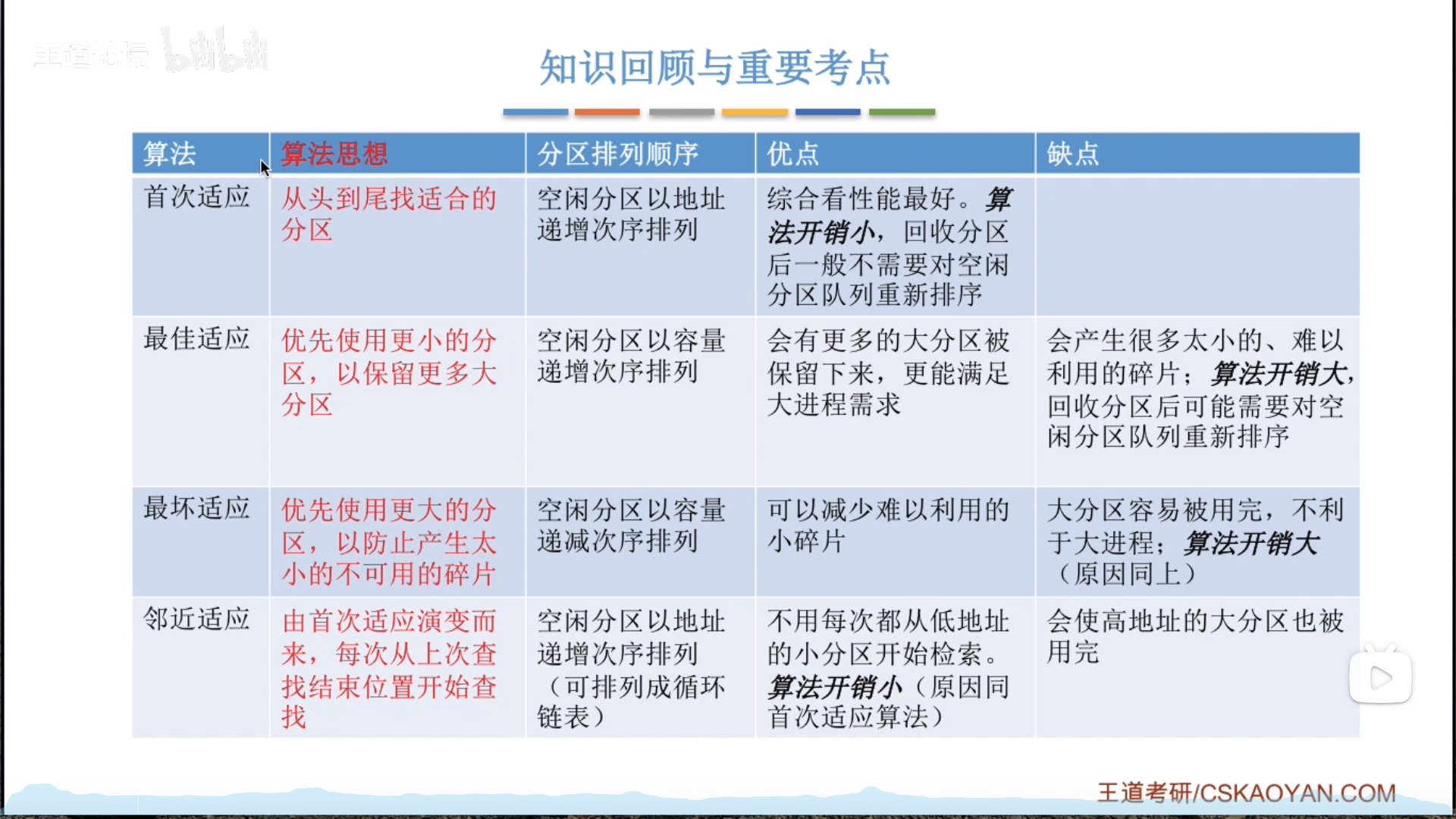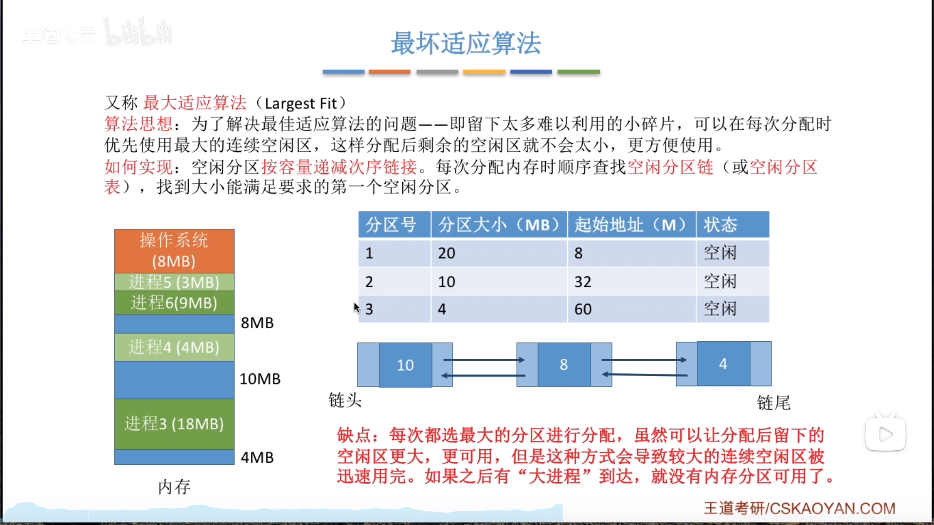 算法开销大小问题:为了保证空闲分区按照规定次序排列,在最佳适应和最坏适应这两种算法中需要经常对整个空闲分区链进行重新排序,这就导致了算法开销更大的问题,而首次适应和邻近适应不需要对整个空闲分区链进行顺序的检查和重新排序,所以开销就更小