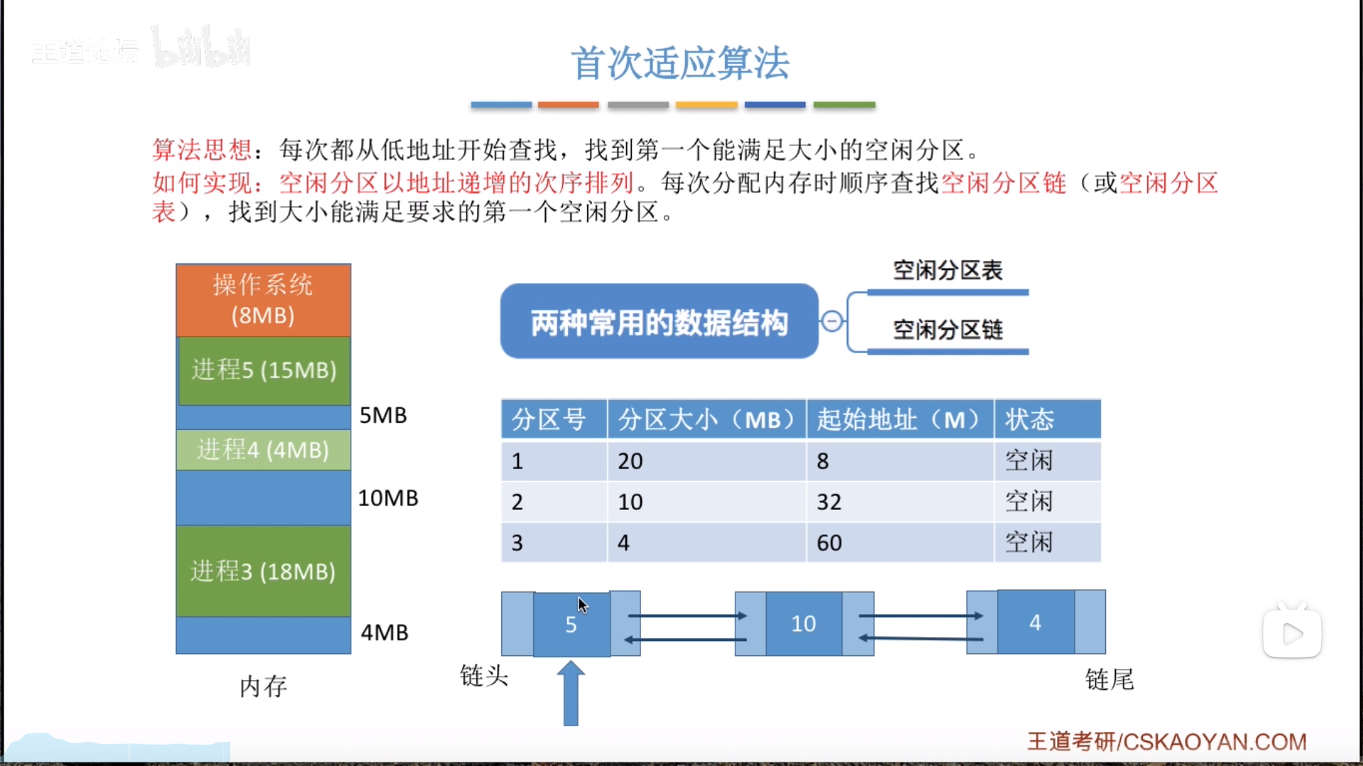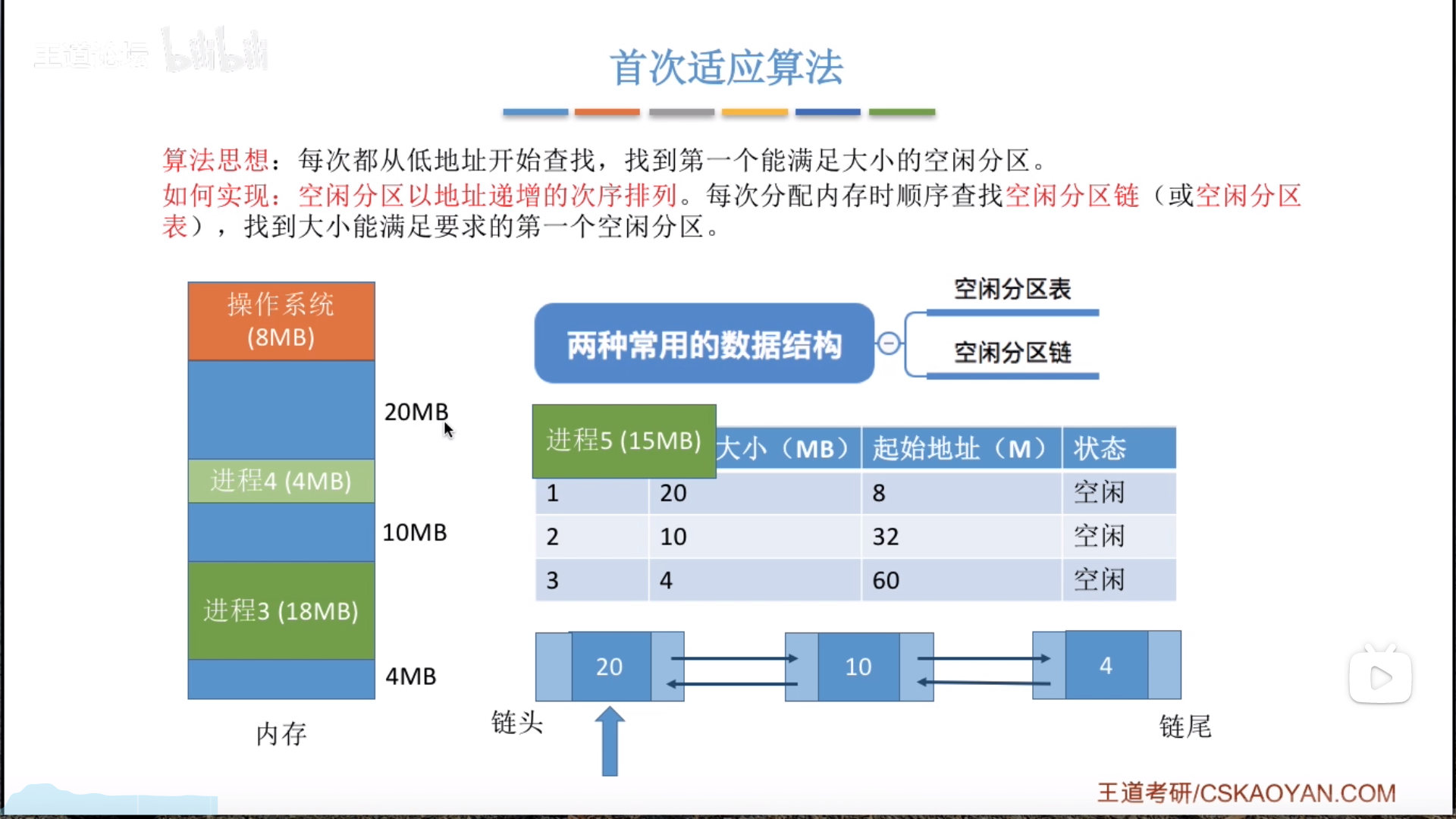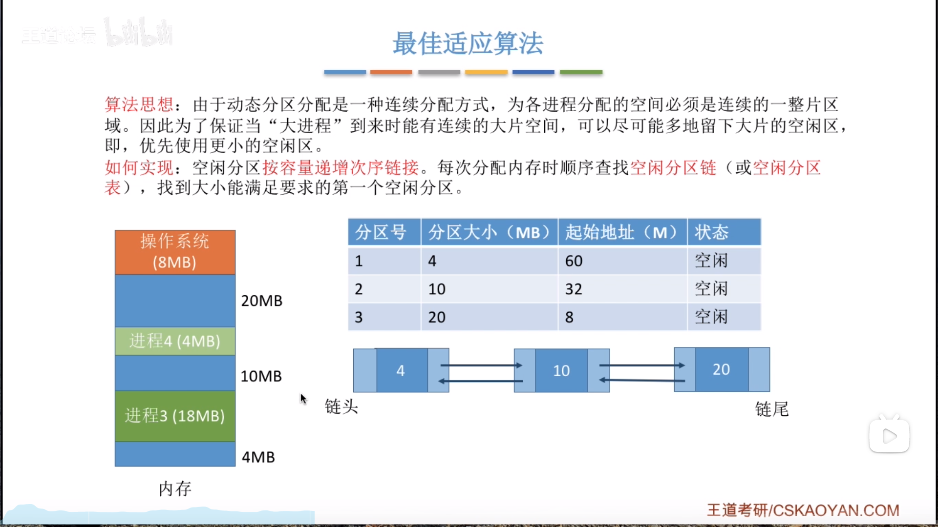 算法开销大小问题:为了保证空闲分区按照规定次序排列,在最佳适应和最坏适应这两种算法中需要经常对整个空闲分区链进行重新排序,这就导致了算法开销更大的问题,而首次适应和邻近适应不需要对整个空闲分区链进行顺序的检查和重新排序,所以开销就更小