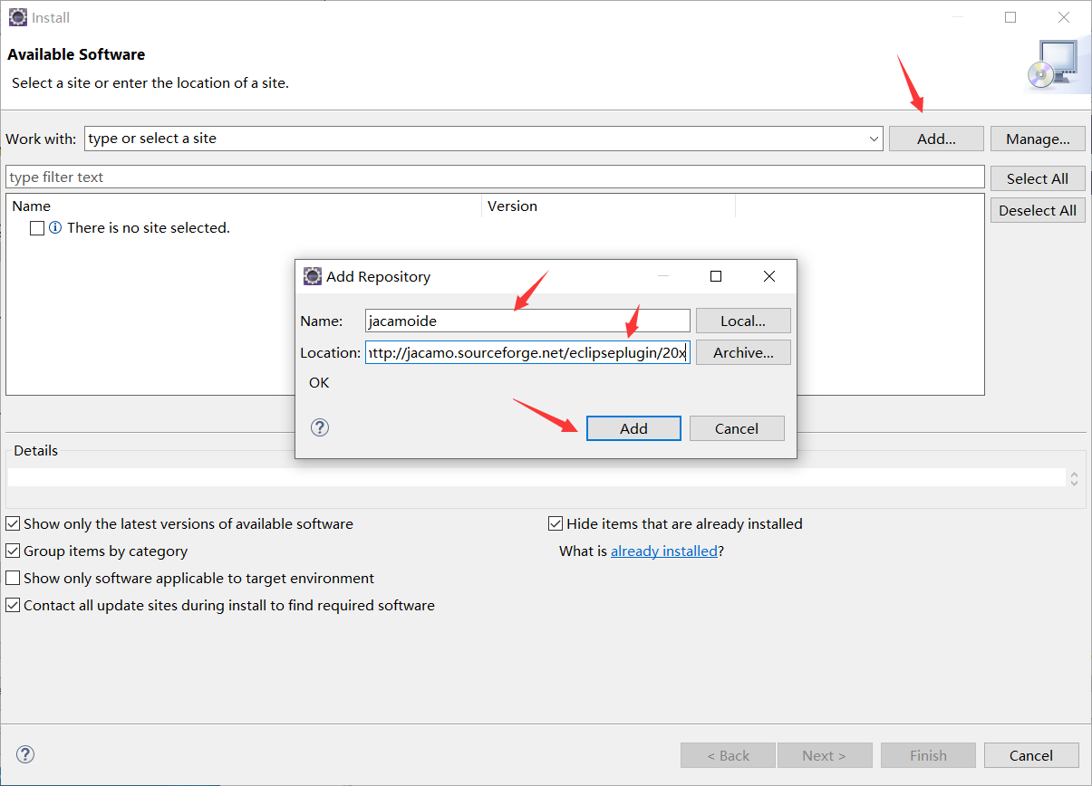 Location输入:http://jacamo.sourceforge.net/eclipseplugin/20x
