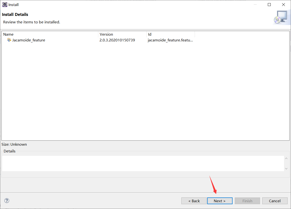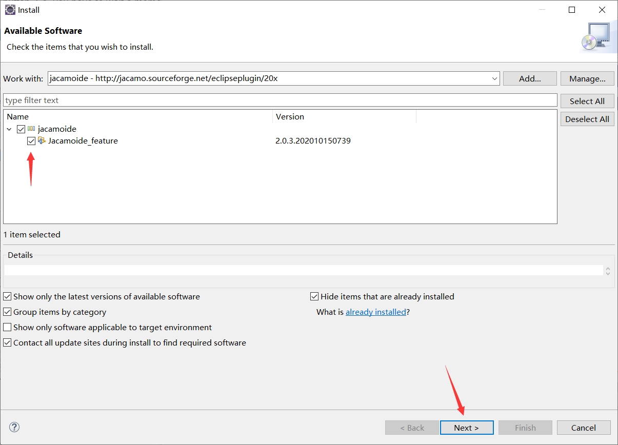 勾选选项"jacamoide",然后按"next"按钮。因此,在Eclipse搜索依赖项时,你必须等待一会儿。