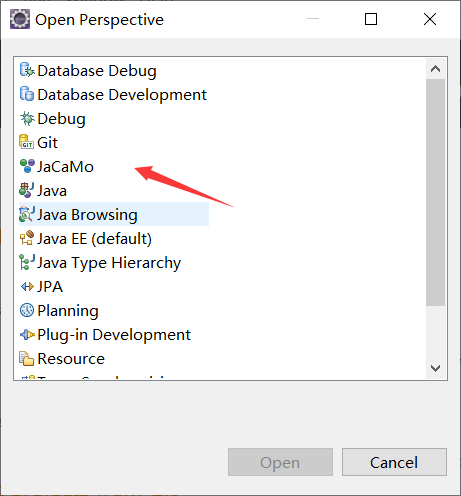 现在你可以打开JaCaMo perspective了。你可以在菜单上选择(Window > Open Perspective > Other)