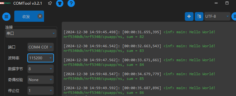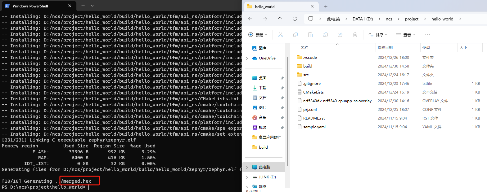 复制hello world到任意位置,在hello world中打开cmd/ps使用west build -b nrf5340dk_nrf5340_cpuapp_ns -d build -p编译工程,稍微修改了下原工程的代码: