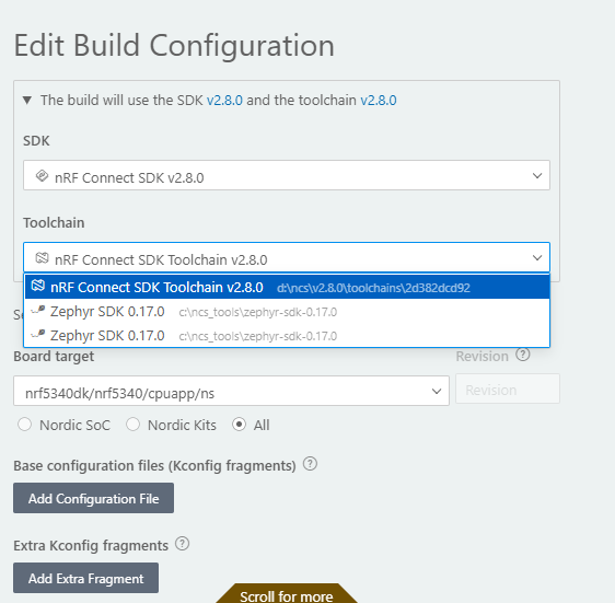 其中ZEPHYR_SDK_INSTALL_DIR用来设置Zephyr自定义工具链地址,在编译项目时可以选择使用zephyr的工具链还是ncs的工具链: