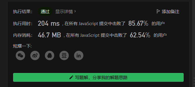 var isPalindrome = function(x) { //排除负数 2 if( x < 0){ 3 return false; 4 } //排除尾数为0且不等于0的数 5 if(x%10==0&&x!=0){ 6 return false; 7 } //用a来判断 8 let a = 0; //遍历循环 x>a用来求中位数 9 while(x>a){ 10 a = a*10 + x%10; 11 x = Math.floor(x/10); 12 } 13 return x === a || x === Math.floor(a/10); 14 };