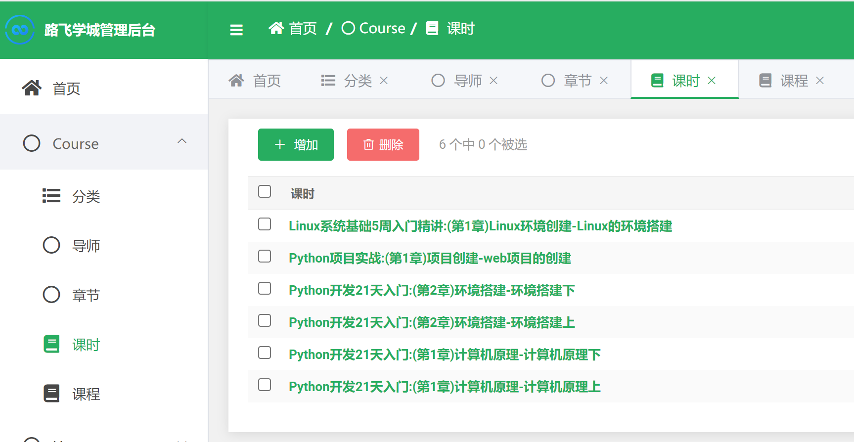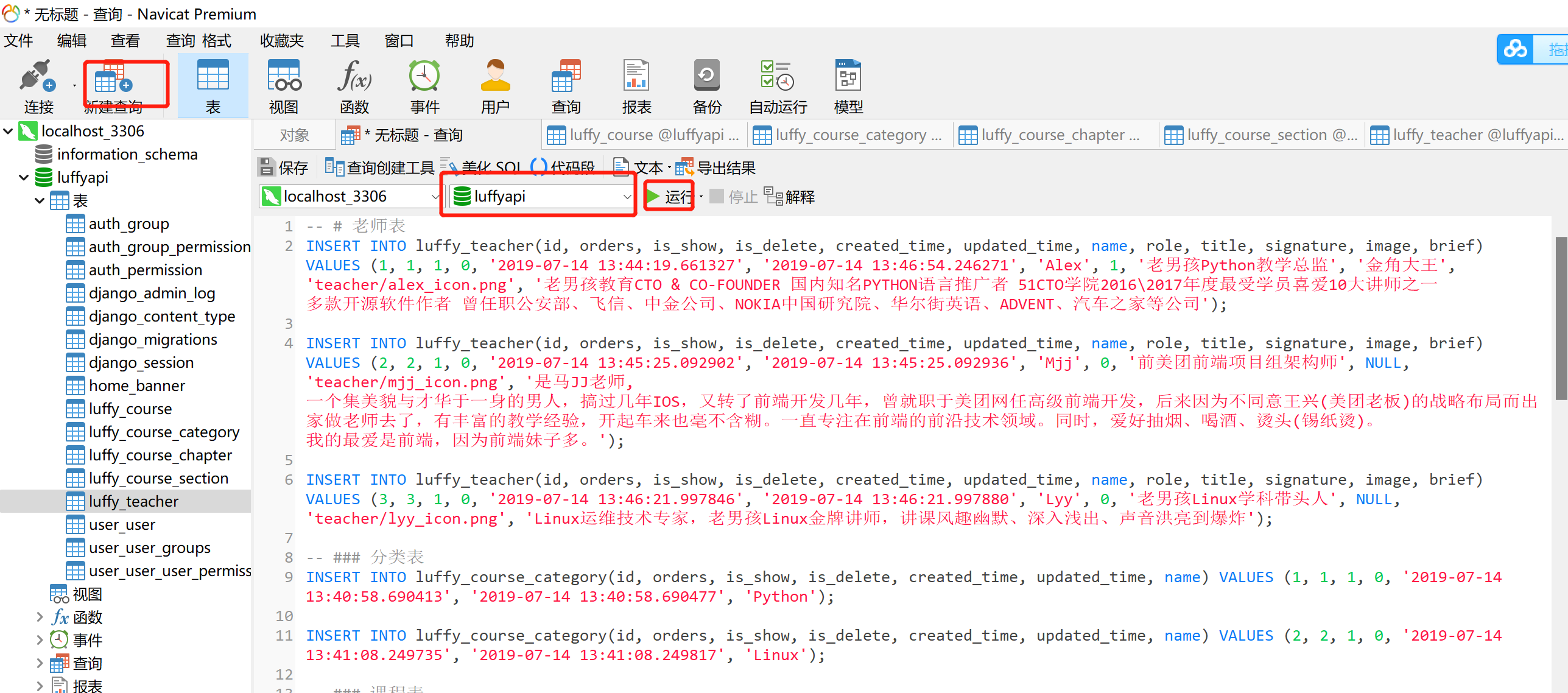 # 老师表 INSERT INTO luffy_teacher(id, orders, is_show, is_delete, created_time, updated_time, name, role, title, signature, image, brief) VALUES (1, 1, 1, 0, '2019-07-14 13:44:19.661327', '2019-07-14 13:46:54.246271', 'Alex', 1, '老男孩Python教学总监', '金角大王', 'teacher/alex_icon.png', '老男孩教育CTO & CO-FOUNDER 国内知名PYTHON语言推广者 51CTO学院2016\2017年度最受学员喜爱10大讲师之一 多款开源软件作者 曾任职公安部、飞信、中金公司、NOKIA中国研究院、华尔街英语、ADVENT、汽车之家等公司'); INSERT INTO luffy_teacher(id, orders, is_show, is_delete, created_time, updated_time, name, role, title, signature, image, brief) VALUES (2, 2, 1, 0, '2019-07-14 13:45:25.092902', '2019-07-14 13:45:25.092936', 'Mjj', 0, '前美团前端项目组架构师', NULL, 'teacher/mjj_icon.png', '是马JJ老师, 一个集美貌与才华于一身的男人,搞过几年IOS,又转了前端开发几年,曾就职于美团网任高级前端开发,后来因为不同意王兴(美团老板)的战略布局而出家做老师去了,有丰富的教学经验,开起车来也毫不含糊。一直专注在前端的前沿技术领域。同时,爱好抽烟、喝酒、烫头(锡纸烫)。 我的最爱是前端,因为前端妹子多。'); INSERT INTO luffy_teacher(id, orders, is_show, is_delete, created_time, updated_time, name, role, title, signature, image, brief) VALUES (3, 3, 1, 0, '2019-07-14 13:46:21.997846', '2019-07-14 13:46:21.997880', 'Lyy', 0, '老男孩Linux学科带头人', NULL, 'teacher/lyy_icon.png', 'Linux运维技术专家,老男孩Linux金牌讲师,讲课风趣幽默、深入浅出、声音洪亮到爆炸'); ### 分类表 INSERT INTO luffy_course_category(id, orders, is_show, is_delete, created_time, updated_time, name) VALUES (1, 1, 1, 0, '2019-07-14 13:40:58.690413', '2019-07-14 13:40:58.690477', 'Python'); INSERT INTO luffy_course_category(id, orders, is_show, is_delete, created_time, updated_time, name) VALUES (2, 2, 1, 0, '2019-07-14 13:41:08.249735', '2019-07-14 13:41:08.249817', 'Linux'); ### 课程表 INSERT INTO luffy_course(id, orders, is_show, is_delete, created_time, updated_time, name, course_img, course_type, brief, level, pub_date, period, attachment_path, status, students, sections, pub_sections, price, course_category_id, teacher_id) VALUES (1, 1, 1, 0, '2019-07-14 13:54:33.095201', '2019-07-14 13:54:33.095238', 'Python开发21天入门', 'courses/alex_python.png', 0, 'Python从入门到入土&&&Python从入门到入土&&&Python从入门到入土&&&Python从入门到入土&&&Python从入门到入土&&&Python从入门到入土&&&Python从入门到入土&&&Python从入门到入土&&&Python从入门到入土&&&Python从入门到入土&&&Python从入门到入土&&&Python从入门到入土', 0, '2019-07-14', 21, '', 0, 231, 120, 120, 0.00, 1, 1); INSERT INTO luffy_course(id, orders, is_show, is_delete, created_time, updated_time, name, course_img, course_type, brief, level, pub_date, period, attachment_path, status, students, sections, pub_sections, price, course_category_id, teacher_id) VALUES (2, 2, 1, 0, '2019-07-14 13:56:05.051103', '2019-07-14 13:56:05.051142', 'Python项目实战', 'courses/mjj_python.png', 0, '', 1, '2019-07-14', 30, '', 0, 340, 120, 120, 99.00, 1, 2); INSERT INTO luffy_course(id, orders, is_show, is_delete, created_time, updated_time, name, course_img, course_type, brief, level, pub_date, period, attachment_path, status, students, sections, pub_sections, price, course_category_id, teacher_id) VALUES (3, 3, 1, 0, '2019-07-14 13:57:21.190053', '2019-07-14 13:57:21.190095', 'Linux系统基础5周入门精讲', 'courses/lyy_linux.png', 0, '', 0, '2019-07-14', 25, '', 0, 219, 100, 100, 39.00, 2, 3); # 章节表 INSERT INTO luffy_course_chapter(id, orders, is_show, is_delete, created_time, updated_time, chapter, name, summary, pub_date, course_id) VALUES (1, 1, 1, 0, '2019-07-14 13:58:34.867005', '2019-07-14 14:00:58.276541', 1, '计算机原理', '', '2019-07-14', 1); INSERT INTO luffy_course_chapter(id, orders, is_show, is_delete, created_time, updated_time, chapter, name, summary, pub_date, course_id) VALUES (2, 2, 1, 0, '2019-07-14 13:58:48.051543', '2019-07-14 14:01:22.024206', 2, '环境搭建', '', '2019-07-14', 1); INSERT INTO luffy_course_chapter(id, orders, is_show, is_delete, created_time, updated_time, chapter, name, summary, pub_date, course_id) VALUES (3, 3, 1, 0, '2019-07-14 13:59:09.878183', '2019-07-14 14:01:40.048608', 1, '项目创建', '', '2019-07-14', 2); INSERT INTO luffy_course_chapter(id, orders, is_show, is_delete, created_time, updated_time, chapter, name, summary, pub_date, course_id) VALUES (4, 4, 1, 0, '2019-07-14 13:59:37.448626', '2019-07-14 14:01:58.709652', 1, 'Linux环境创建', '', '2019-07-14', 3); ### 课时表 INSERT INTO luffy_course_Section(id, is_show, is_delete, created_time, updated_time, name, orders, section_type, section_link, duration, pub_date, free_trail, chapter_id) VALUES (1, 1, 0, '2019-07-14 14:02:33.779098', '2019-07-14 14:02:33.779135', '计算机原理上', 1, 2, NULL, NULL, '2019-07-14 14:02:33.779193', 1, 1); INSERT INTO luffy_course_Section(id, is_show, is_delete, created_time, updated_time, name, orders, section_type, section_link, duration, pub_date, free_trail, chapter_id) VALUES (2, 1, 0, '2019-07-14 14:02:56.657134', '2019-07-14 14:02:56.657173', '计算机原理下', 2, 2, NULL, NULL, '2019-07-14 14:02:56.657227', 1, 1); INSERT INTO luffy_course_Section(id, is_show, is_delete, created_time, updated_time, name, orders, section_type, section_link, duration, pub_date, free_trail, chapter_id) VALUES (3, 1, 0, '2019-07-14 14:03:20.493324', '2019-07-14 14:03:52.329394', '环境搭建上', 1, 2, NULL, NULL, '2019-07-14 14:03:20.493420', 0, 2); INSERT INTO luffy_course_Section(id, is_show, is_delete, created_time, updated_time, name, orders, section_type, section_link, duration, pub_date, free_trail, chapter_id) VALUES (4, 1, 0, '2019-07-14 14: