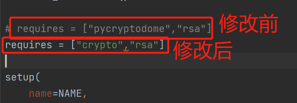 3.下载tar.gz包,需要解压后,将解压后的文件(alipay-sdk-python-3.3.398)放到python的Lib\\site-packages的文件目录下, 我的路径是:D:\pythonSoftware\Lib\site-packages,进入到文件中修改 setup.py, 将requires = ["pycryptodome","rsa"] 修改成 requires = ["crypto","rsa"]