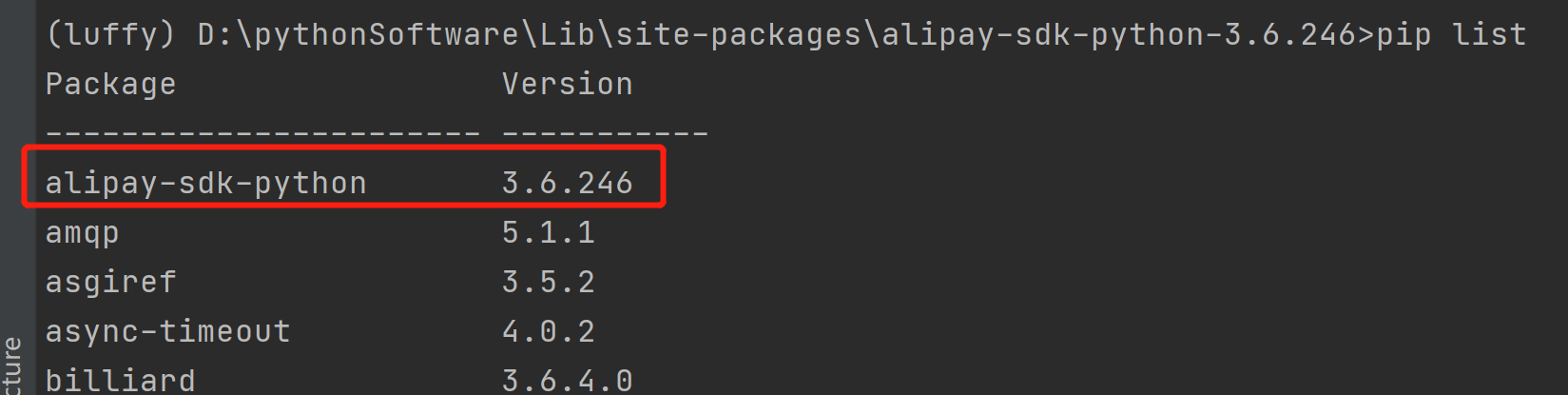 # cmd窗口 # cd到路径:D:\pythonSoftware\Lib\site-packages\alipay-sdk-python-3.6.246 python setup.py install