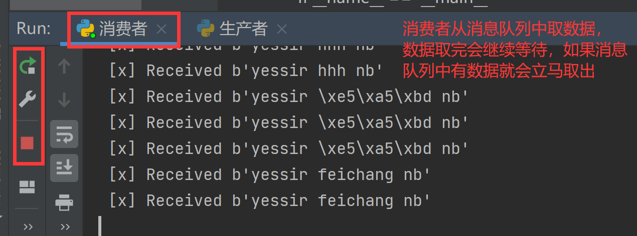 消费者可以从消息队列中拿到生产者发送的数据,并且夯住,等待,如果消息队列里有数据,就会直接取出来