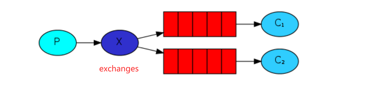 向多个消费者传递一条消息。这种模式被称为“发布/订阅”,即发布一条消息,多个消费者都能接收到。如下图所示:生产者发送一条数据,通过交换机分发出多条队列,每个消费者都可以从队列中获取数据。
