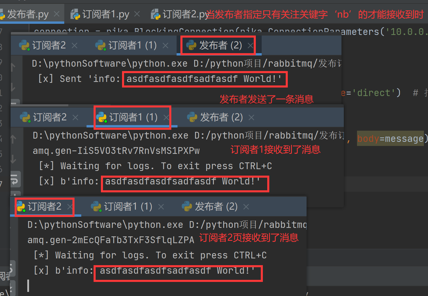 如果发布者的 routing_key 指定 ‘nb’,那两个订阅者都能接收到消息