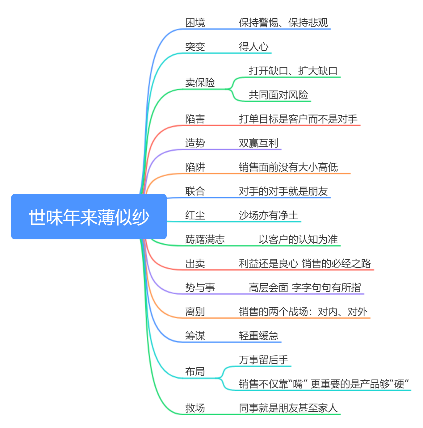 这一篇的内容看起来只是简单讲述了杨耕如何利用自己的智慧、心理去拿下利民公司信息化管理的大项目,以及和自己亦师亦友的田云舒分别的情节。但在这些轻描淡写的故事里的确又有很多值得思索地部分,不仅仅是上图所总结的每章节的主要内容,回头看看这一篇确实是“世味年来薄似纱”。