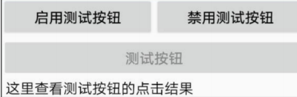 <LinearLayout xmlns:android="http://schemas.android.com/apk/res/android" android:layout_width="match_parent" android:layout_height="match_parent" android:orientation="vertical"> <LinearLayout android:layout_width="match_parent" android:layout_height="wrap_content" android:orientation="horizontal"> <Button android:id="@+id/btn_enable" android:layout_width="0dp" android:layout_height="wrap_content" android:layout_weight="1" android:text="启用测试按钮" android:textColor="#000000" android:textSize="17sp" /> <Button android:id="@+id/btn_disable" android:layout_width="0dp" android:layout_height="wrap_content" android:layout_weight="1" android:text="禁用测试按钮" android:textColor="#000000" android:textSize="17sp" /> </LinearLayout> <Button android:id="@+id/btn_test" android:layout_width="match_parent" android:layout_height="wrap_content" android:enabled="false" android:text="测试按钮" android:textColor="#888888" android:textSize="17sp" /> <TextView android:id="@+id/tv_result" android:layout_width="match_parent" android:layout_height="wrap_content" android:paddingLeft="5dp" android:text="这里查看测试按钮的点击结果" android:textColor="#000000" android:textSize="17sp" /> </LinearLayout>