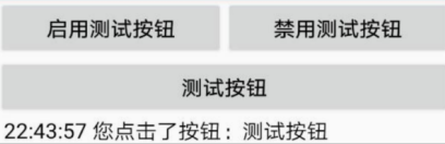 // 因为按钮控件的setOnClickListener方法来源于View基类,所以也可对findViewById得到的视图直 接设置点击监听器 findViewById(R.id.btn_enable).setOnClickListener(this); findViewById(R.id.btn_disable).setOnClickListener(this); btn_test = findViewById(R.id.btn_test); // 获取名叫btn_test的按钮控件 btn_test.setOnClickListener(this); // 设置btn_test的点击监听器 @Override public void onClick(View v) { // 点击事件的处理方法 // 由于多个控件都把点击监听器设置到了当前页面,因此公共的onClick方法内部需要区分来自于哪个 按钮 if (v.getId() == R.id.btn_enable) { // 点击了按钮“启用测试按钮” btn_test.setTextColor(Color.BLACK); // 设置按钮的文字颜色 btn_test.setEnabled(true); // 启用当前控件 } else if (v.getId() == R.id.btn_disable) { // 点击了按钮“禁用测试按钮” btn_test.setTextColor(Color.GRAY); // 设置按钮的文字颜色 btn_test.setEnabled(false); // 禁用当前控件 } else if (v.getId() == R.id.btn_test) { // 点击了按钮“测试按钮” String desc = String.format("%s 您点击了按钮:%s", DateUtil.getNowTime(), ((Button) v).getText()); tv_result.setText(desc); // 设置文本视图的文本内容 } }