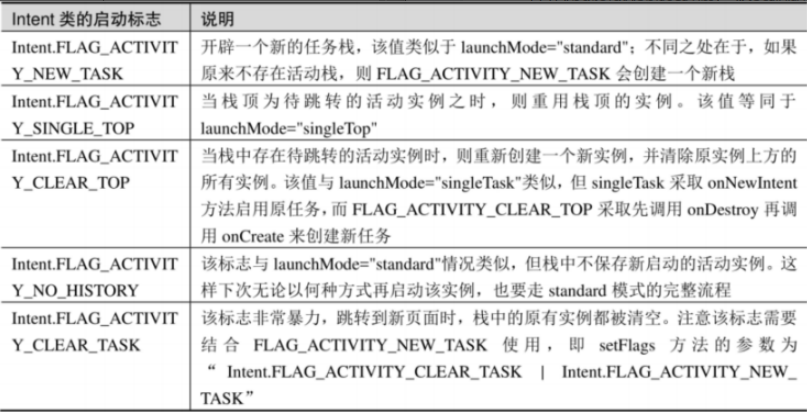 式,通过启动模式控制活动的出入栈行为。App提供了两种办法用于设置活动页面的启动式,其一是修改AndroidManifest.xml,在指定的activity节点添加属性android:launchMode,表本活动以哪个启动模式运行。其二是在代码中调用Intent对象的setFlags方法,表明后续打开活动页面采用该启动标志。