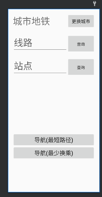 <?xml version="1.0" encoding="UTF-8"?> <LinearLayout xmlns:android="http://schemas.android.com/apk/res/android" xmlns:tools="http://schemas.android.com/tools" android:layout_width="match_parent" android:layout_height="match_parent" android:orientation="vertical" tools:context=".MainActivity"> <LinearLayout android:layout_width="match_parent" android:layout_height="match_parent" android:layout_marginLeft="20dp" android:layout_marginTop="20dp" android:layout_marginRight="20dp" android:layout_weight="1" android:orientation="vertical"> <LinearLayout android:layout_width="match_parent" android:layout_height="wrap_content" android:orientation="horizontal"> <TextView android:id="@+id/textview1" android:layout_width="match_parent" android:layout_height="match_parent" android:layout_weight="1" android:text="城市地铁" android:textSize="40dp" /> <Button android:id="@+id/button1" android:layout_width="match_parent" android:layout_height="match_parent" android:layout_weight="2" android:text="更换城市" android:textSize="20dp" /> </LinearLayout> <LinearLayout android:layout_width="match_parent" android:layout_height="wrap_content" android:layout_marginTop="20dp" android:orientation="horizontal"> <EditText android:id="@+id/editText1" android:layout_width="0dp" android:layout_height="match_parent" android:layout_weight="2" android:hint="线路" android:textSize="40dp" /> <Button android:id="@+id/button2" android:layout_width="0dp" android:layout_height="80sp" android:layout_weight="1" android:text="查询" android:textSize="17dp" /> </LinearLayout> <LinearLayout android:layout_width="match_parent" android:layout_height="wrap_content" android:layout_marginTop="20dp" android:orientation="horizontal"> <EditText android:id="@+id/editText2" android:layout_width="0dp" android:layout_height="match_parent" android:layout_weight="2" android:hint="站点" android:textSize="40dp" /> <Button android:id="@+id/button3" android:layout_width="0dp" android:layout_height="80sp" android:layout_weight="1" android:text="查询" android:textSize="17dp" /> </LinearLayout> <LinearLayout android:layout_width="match_parent" android:layout_height="250sp" android:orientation="vertical"> <ScrollView android:layout_width="match_parent" android:layout_height="wrap_content"> <TextView android:id="@+id/textview2" android:layout_width="match_parent" android:layout_height="wrap_content" android:text="" android:textSize="40dp" /> </ScrollView> </LinearLayout> <LinearLayout android:layout_width="match_parent" android:layout_height="wrap_content" android:orientation="vertical"> <Button android:id="@+id/button4" android:layout_width="match_parent" android:layout_height="wrap_content" android:text="导航(最短路径)" android:textSize="25dp" /> <Button android:id="@+id/button5" android:layout_width="match_parent" android:layout_height="wrap_content" android:text="导航(最少换乘)" android:textSize="25dp" /> </LinearLayout> </LinearLayout> </LinearLayout>