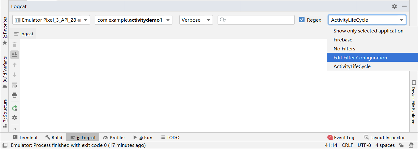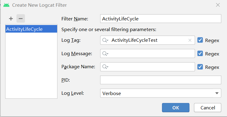 打开Logcat,创建ActivityLifeCycle过滤器,Log Tag为ActivityLifeCycleTest。