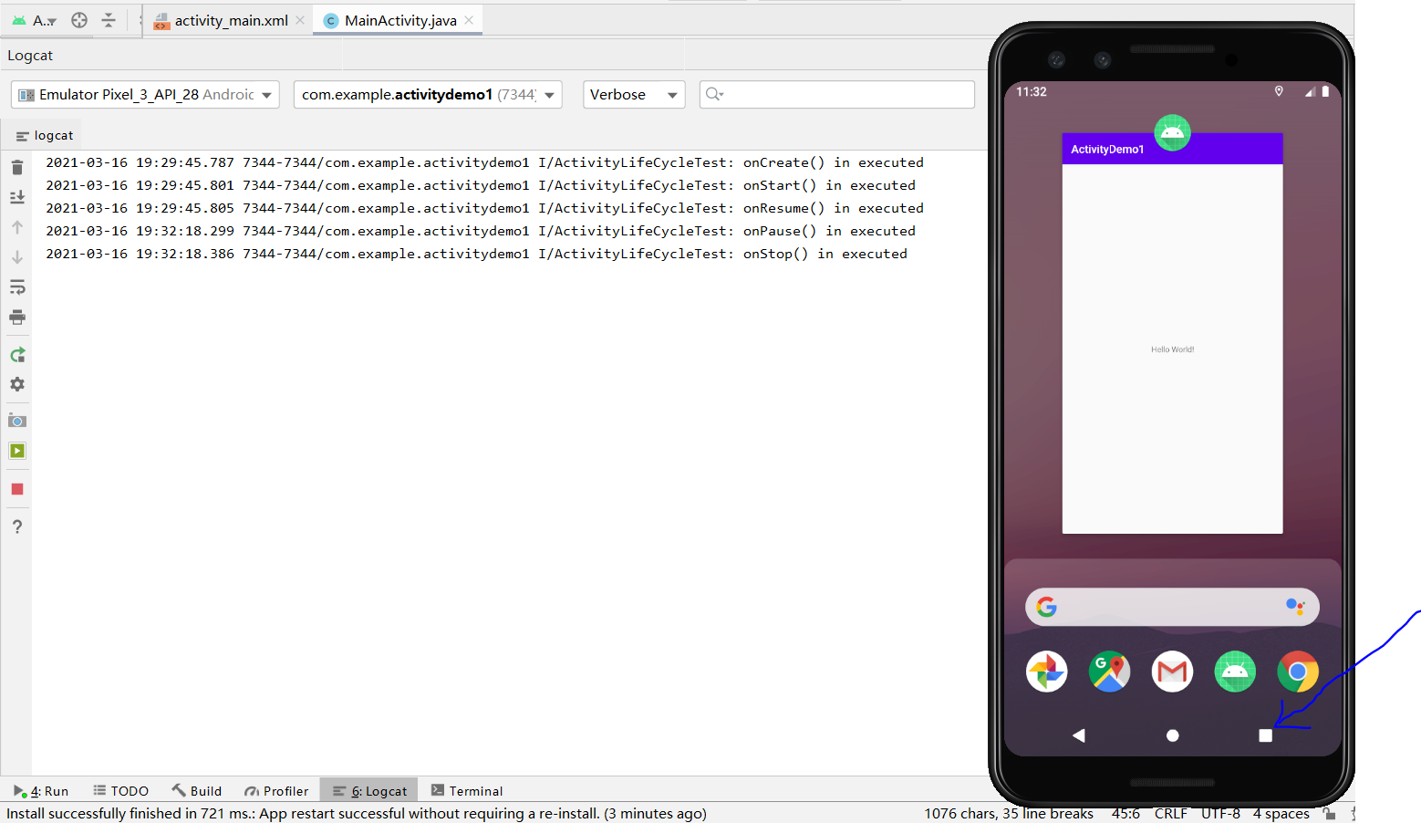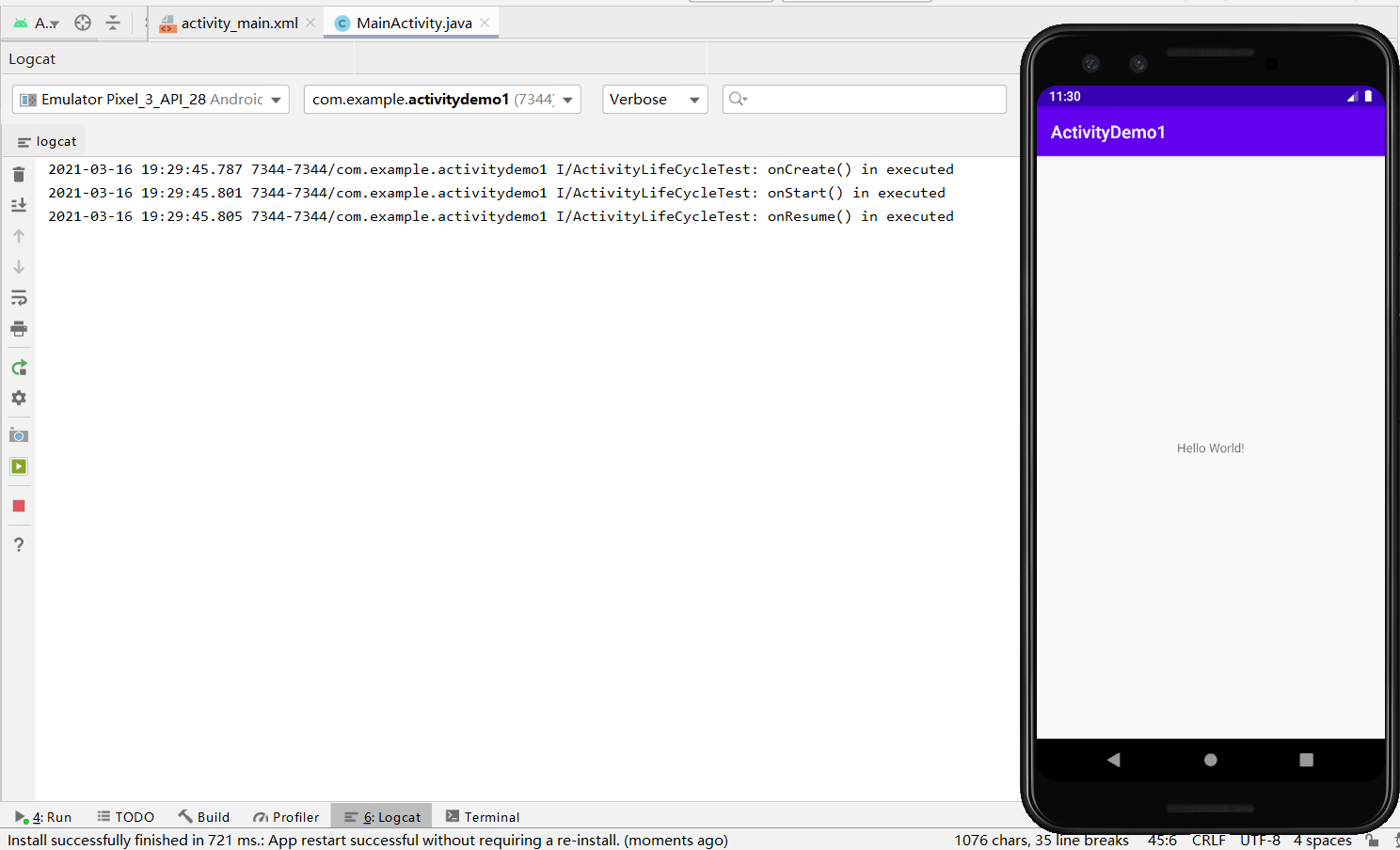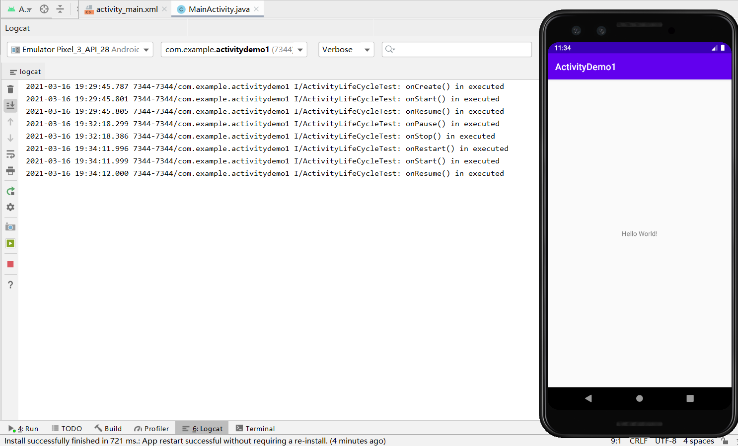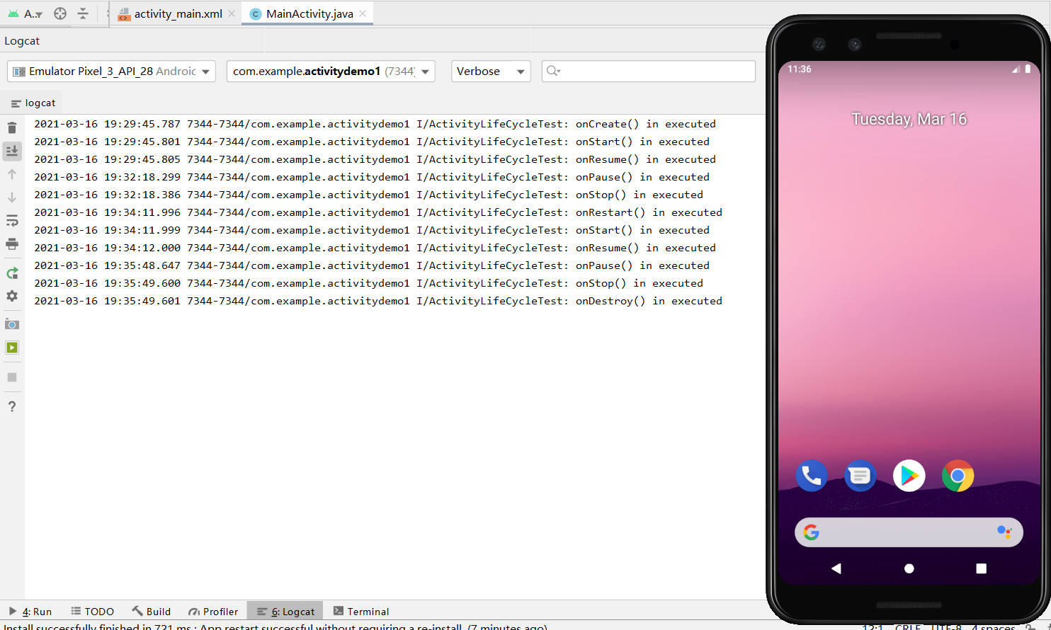 //MainActivity.java参考代码 @Override protected void onCreate(Bundle savedInstanceState) { super.onCreate(savedInstanceState); setContentView(R.layout.activity_main); Log.i("ActivityLifeCycleTest","onCreate() in executed"); } @Override protected void onRestart(){ super.onRestart(); Log.i("ActivityLifeCycleTest","onRestart() in executed"); } @Override protected void onStart(){ super.onStart(); Log.i("ActivityLifeCycleTest","onStart() in executed"); } @Override protected void onResume(){ super.onResume(); Log.i("ActivityLifeCycleTest","onResume() in executed"); } @Override protected void onPause(){ super.onPause(); Log.i("ActivityLifeCycleTest","onPause() in executed"); } @Override protected void onStop(){ super.onStop(); Log.i("ActivityLifeCycleTest","onStop() in executed"); } @Override protected void onDestroy(){ super.onDestroy(); Log.i("ActivityLifeCycleTest","onDestroy() in executed"); }
