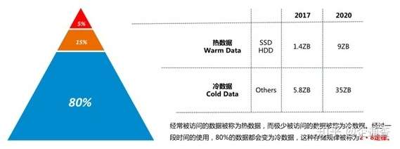 数据量的爆炸式增长以及数据类型的日益细化,让数据分级和冷热数据分治成为降低单位容量数据成本、提升数据存储效率和密度的有效方式。在企业的数据中心中,只有约20%的数据是被经常访问的,IOPS(磁盘性能指标)要求100K 级别,剩余的则访问频率急剧下降,在10k 甚至以下。既然需求不同,就能够将不同类型的数据存储在不同的介质上,以最大化运用存储的效率。