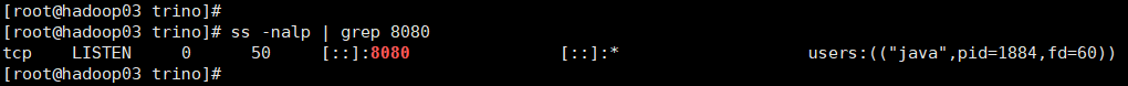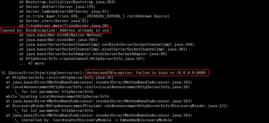 (1) 查询Trino日志发现:BindException: Address already in use,说明8080端口已经被其他应用占用了。