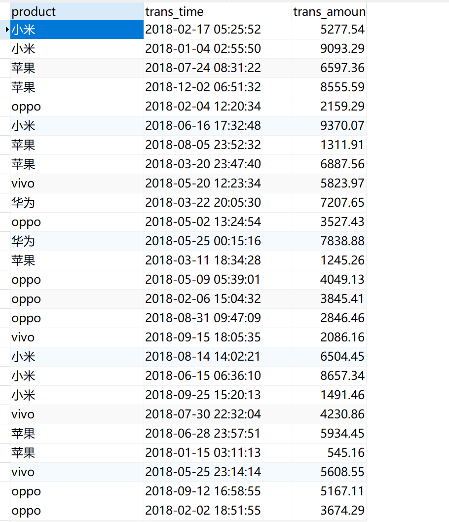 CREATE TABLE `t_trans_detail` ( `product` varchar(20) DEFAULT NULL COMMENT '产品', `trans_time` datetime DEFAULT NULL COMMENT '交易时间', `trans_amount` decimal(20,2) DEFAULT NULL COMMENT '交易金额' ) ENGINE=InnoDB DEFAULT CHARSET=utf8mb4 COLLATE=utf8mb4_general_ci;