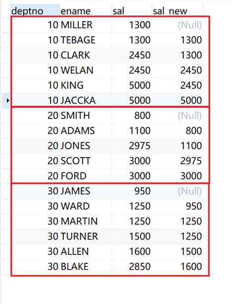 SELECT deptno, ename, sal, lag( sal, 1 ) over ( PARTITION BY deptno ORDER BY sal ) AS sal_new FROM emp;