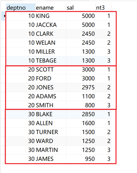 SELECT deptno, ename, sal, ntile( 3 ) over ( PARTITION BY deptno ORDER BY sal DESC ) AS nt3 FROM emp;